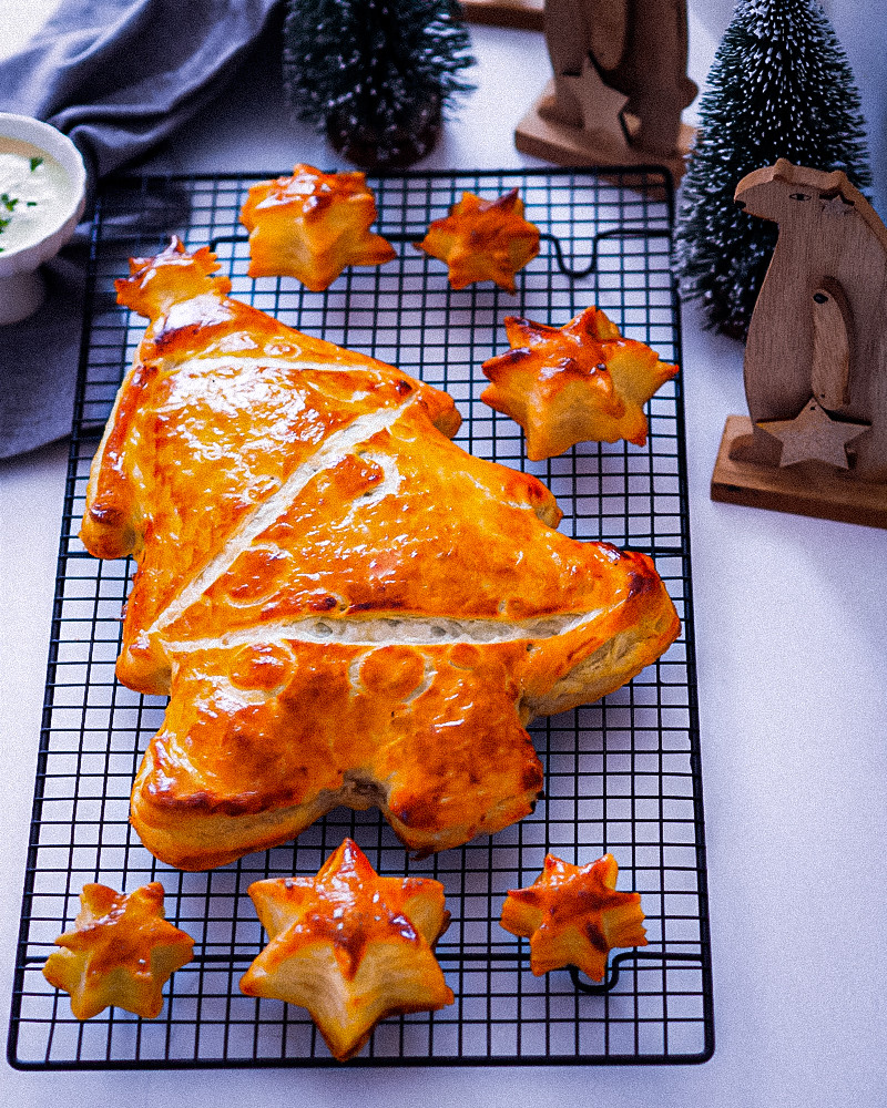 Avec l’aide d’un couteau, décorez la pâte. Pour permettre à la vapeur de s’échapper et ainsi obtenir une cuisson régulière, piquez la pâte 6 fois sur la surface. Faites-le au niveau du dessin, afin d’éviter de les voir après cuisson. Saupoudrez de fleur de sel.